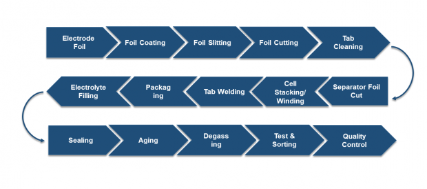 电极镀层厚度通常为100 μm,而隔离膜为50 μm。阳极膜是镀石墨的铜膜,阴极膜是镀锂金属氧化物的铝膜,隔离膜则由聚丙烯和聚乙烯构成。锂电池生产过程: